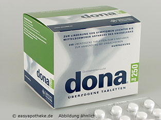 Die Dona 250 Tabletten werden zur unterstützenden Behandlung einer leichten bis mittelschweren Arthrose im Kniegelenk angewendet. Die Tabletten enthalten den körpereigenen Wirkstoff Glucosamin. Das Glucosamin ist ein Grundbaustoff für alle Knorpel, Sehnen und Bänder im Körper. Es kommt zu einer Stimulation der Produktion von Knorpelbausteinen, welche für die Reparatur des Knorpelgewebes zuständig sind. Die Dona 250 Tabletten sorgen für eine Funktionsverbesserung und einer Schmerzlinderung bei einer Arthrose des Kniegelenks.