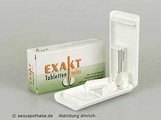 Der Exakt Tablettenteiler wird zur einfachen, sauberen und exakten Teilung von Tabletten angewendet. Der Tablettenteiler besteht aus einem Kunststoffgehäuse mit einer V-förmigen Einkerbung am Boden und einer scharfen Klinge im Deckel. In die V-förmige Einkerbung wird die Tablette so eingelegt, dass sie nicht zur Seite rutschen oder rausspringen kann. Wird der Exakt Tablettenteiler nun heruntergedrückt schneidet die Klinge die Tablette sauber in zwei Teile.